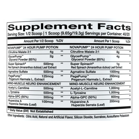 Innovapharm Nova-Pump Neuro Stim-Free Pump Pre-Workout offers an awesome concoction of nootropic ingredients and 5 seriously-satisfying pump-enhancing ingredients! A clinically dosed 100% full disclosure blend. A brain-boosting cocktail of only the best scientifically backed ingredients and some seriously awesome muscular pumps.